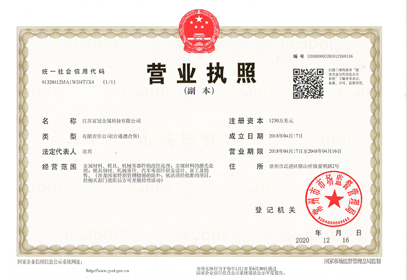 江蘇富冠金屬科技有限公司(以下簡稱:“公司”)成立于2018年4月,隸屬于鑫昌泰集團(tuán),是常州市經(jīng)開區(qū)招商引資的重點(diǎn)外資企業(yè),注冊資本1230萬美元,座落于常州市經(jīng)開區(qū)橫山橋智能裝備產(chǎn)業(yè)園,占地面積22762.8平方米,員工總數(shù)100人。公司主要經(jīng)營:金屬材料、模具、機(jī)械零部件的改性處理;金屬材料的激光處理;模具鋼材、機(jī)械零件、汽車零部件研發(fā)設(shè)計(jì)、加工及銷售。并具有真空淬火、普通淬火、調(diào)質(zhì)、去應(yīng)力回......